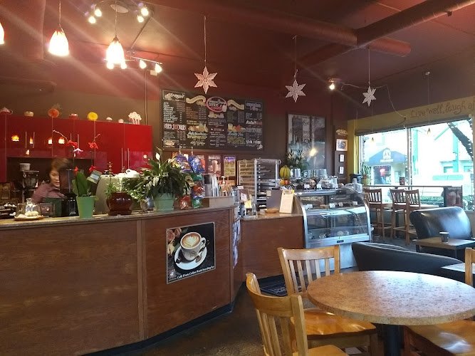 Cafe serving cupcakes, coffee & bubble tea from a counter in a cozy, sunny space with outdoor seats.