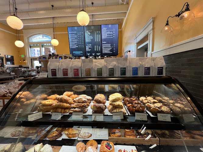 Specialty caffeine drinks & pastries served in a train station setup with outdoor seats.