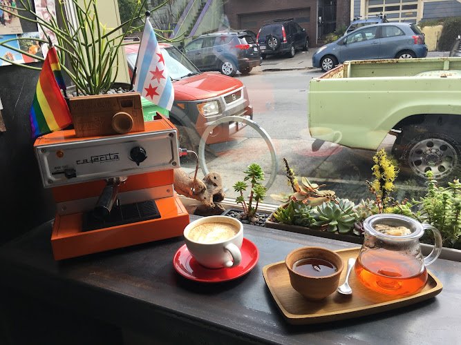Storefront coffeehouse boasting a whimsical ambiance plus pastry & coffee beans from Linea Caffe.