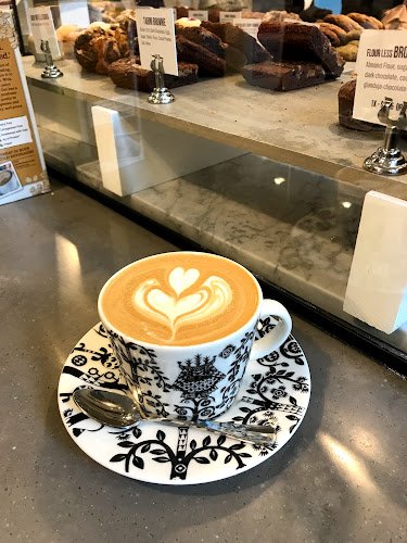 Gourmet espresso drinks and housemade baked goods are served in a stylish, minimalist space.