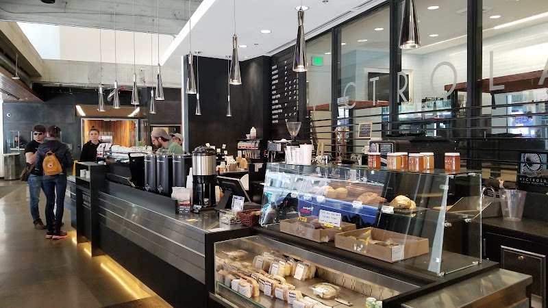 Bustling coffee shop featuring house-roasted espresso blends & pastries in a modern interior.
