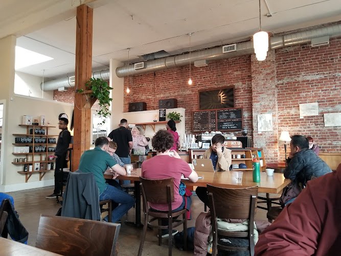 Bustling coffee shop featuring house-roasted espresso blends & pastries in a modern interior.